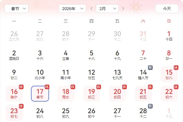 根据国务院办公厅关于2026年部分节假日安排的通知,2026年春节期间,阳泉市住房公积金管理中心将于2月15日至2月23日放假调休,共9天。2月14日(星期六)、2月28日(星期六)正常上班。放假期间,我中心各分支机构(市区管理部、郊区管理部、平定管理部、盂县管理部,华阳集团分中心)柜面业务暂停办理。公积金贷款还款、逾期还款、冲还贷扣款业务、异地转移接续业务节假日期间暂停办理,顺延至2月24日工作日正常扣款。微信公众号和个人网厅公积金查询、提取等线上业务正常办理。