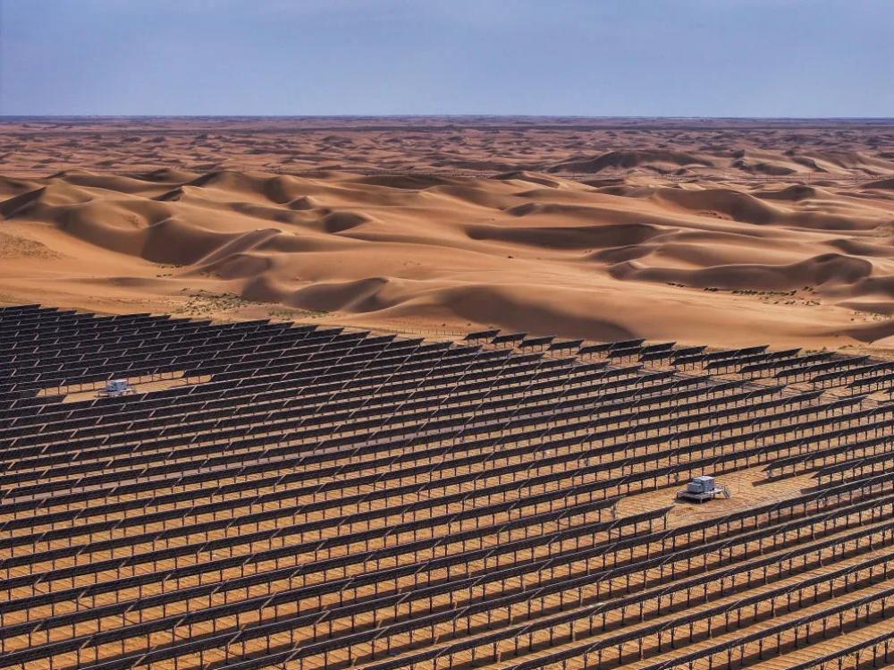 这是2025年6月5日拍摄的位于内蒙古巴彦淖尔市磴口县的乌兰布和东北部新能源基地100万千瓦光伏先导工程项目(无人机照片)。该项目地处乌兰布和沙漠。新华社记者 连振 摄